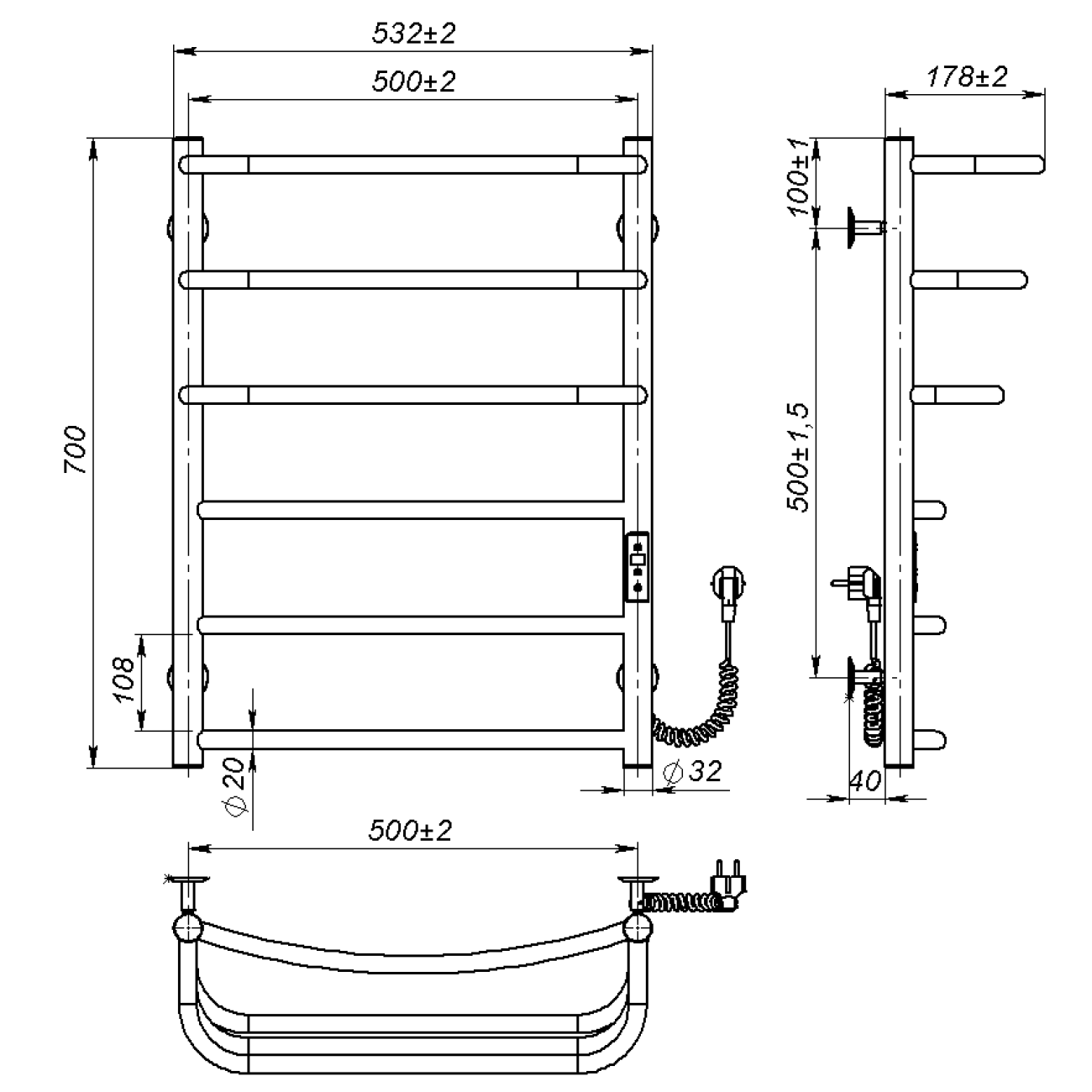Основні характеристики Рушникосушарка електрична Prima (700*500,6,Сіра,Праве підключення,JD03)
