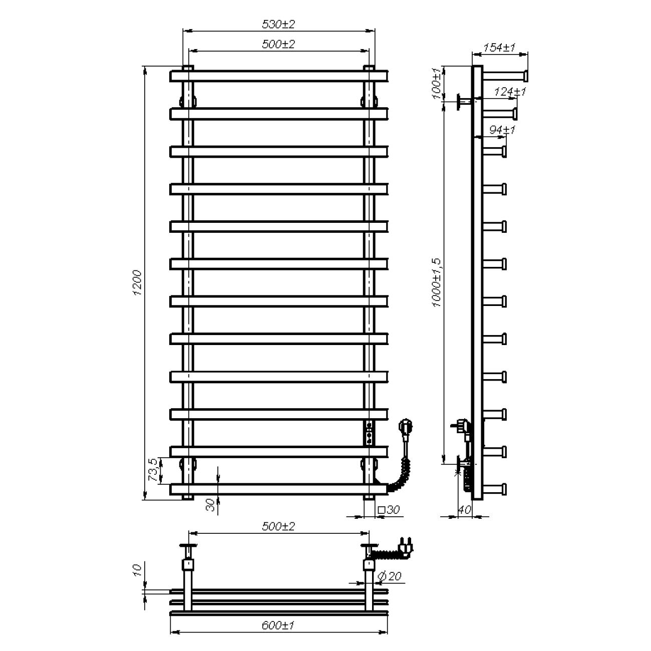 Основні характеристики Рушникосушарка електрична Radiant (1200*500,10,Полірована,Праве підключення,JD04)