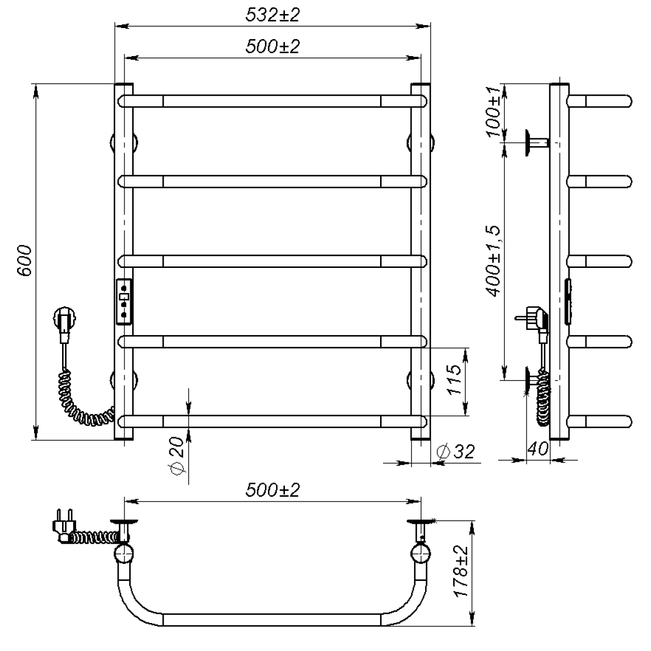 Основні характеристики Рушникосушарка електрична Sunny (600*500,5,Сіра,Ліве підключення,JD03)