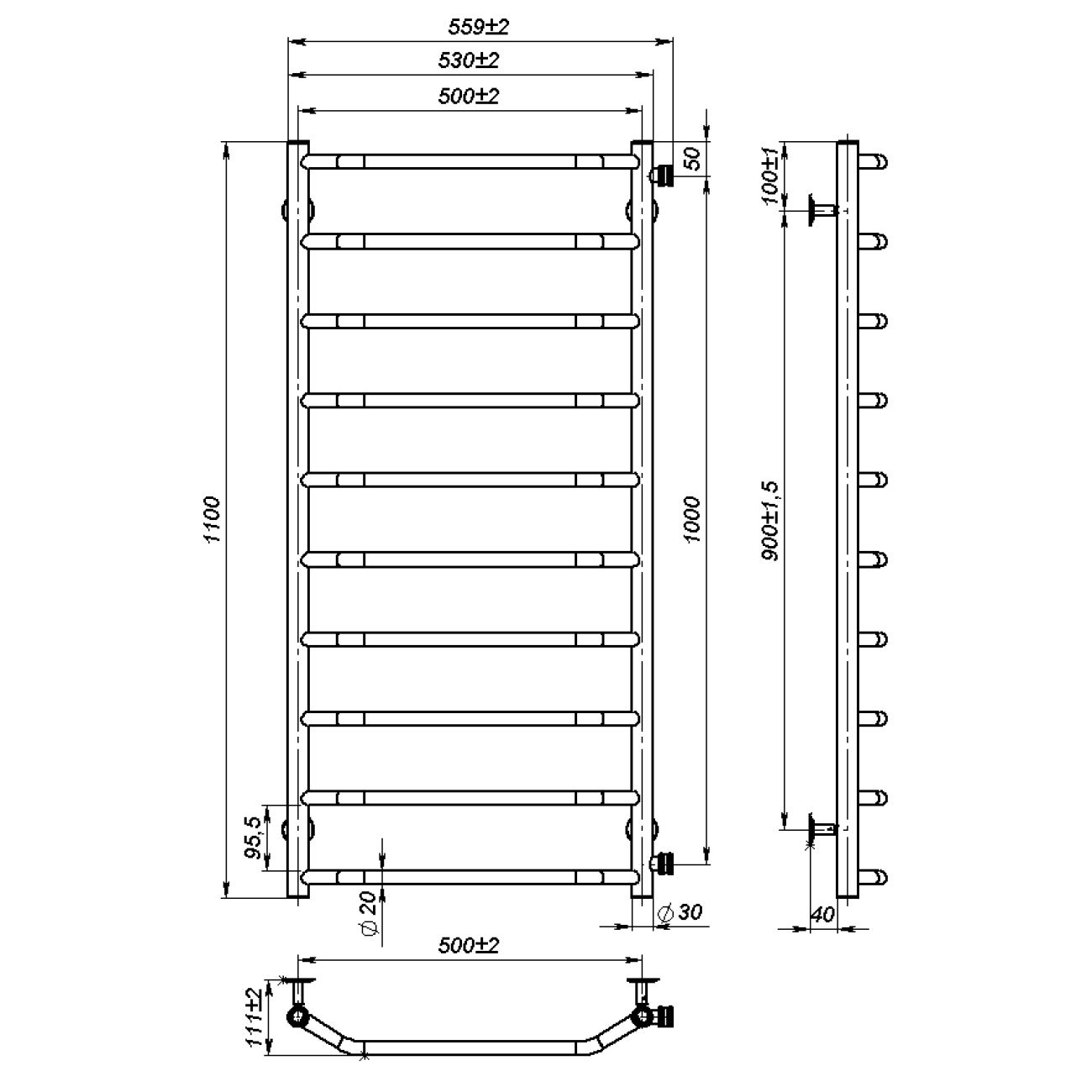 Основні характеристики Рушникосушарка водяна Ava (1100*500,10,Чорна,Праве підключення)
