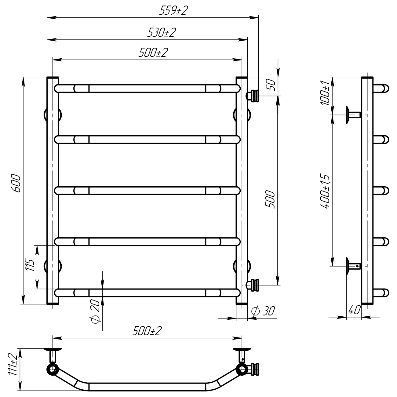 Основні характеристики Рушникосушарка водяна Ava (600*500,5,Чорна,Праве підключення)