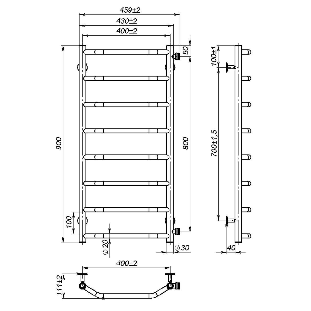 Основні характеристики Рушникосушарка водяна Ava (900*400,8,Чорна,Праве підключення)