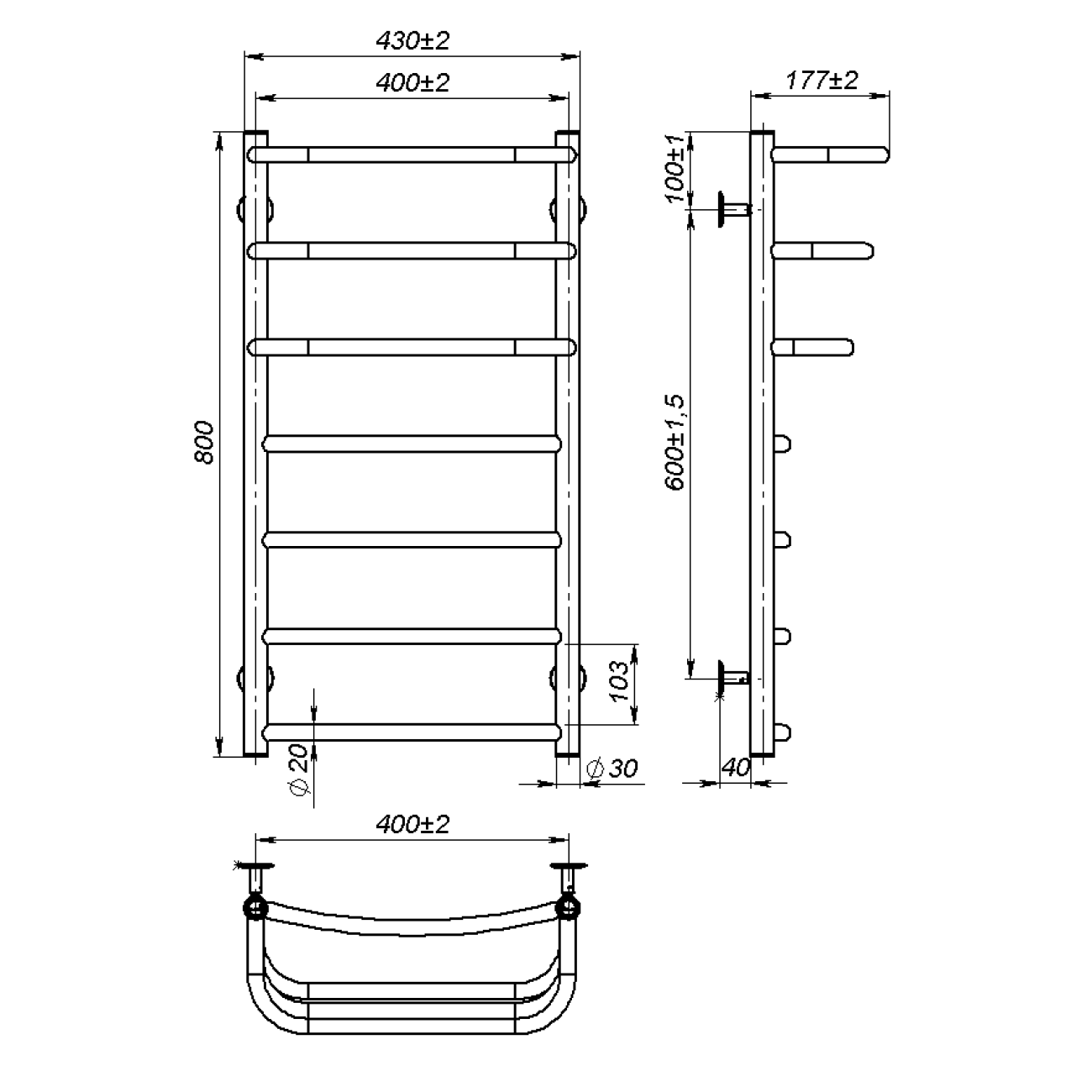 Основні характеристики Рушникосушарка водяна Prima (800*400,7,Чорна,Нижнє підключення)